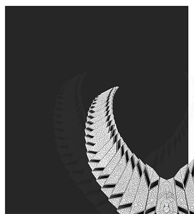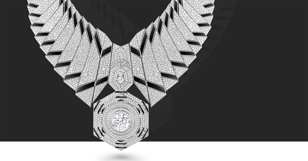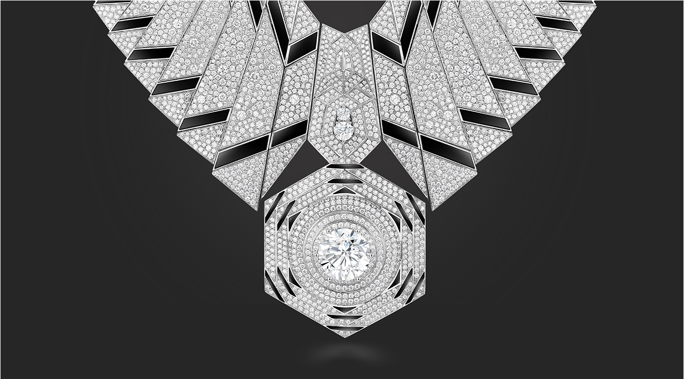 靈感源自雪域圣殿布達拉宮,階梯造型運用黑色瑪瑙和大小鉆石排列,彰顯厚重的年代感,打造聯結天上與人間的圓滿匯集道,盡顯橫空出世之態,氣貫蒼穹之勢。中央西藏白塔造型,上圓下方,結構對稱,與20克拉主鉆交相輝映。獨特的建筑藝術形象,完美詮釋了布達拉宮的雄偉壯麗與莊嚴神秘,閃爍著美學與設計的靈感之光。